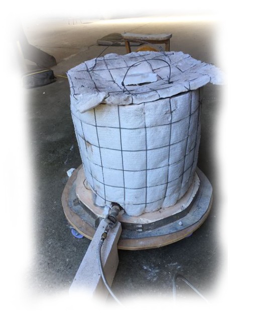 Dieser gasbefeuerte Ofen hat statt des Maschendrahtes eine Ummantelung aus Metal, sicherlich die feinere Variante. Solche Öfen können Sie sich auch schon fertig zusammengebaut kaufen, z.B. hier:
